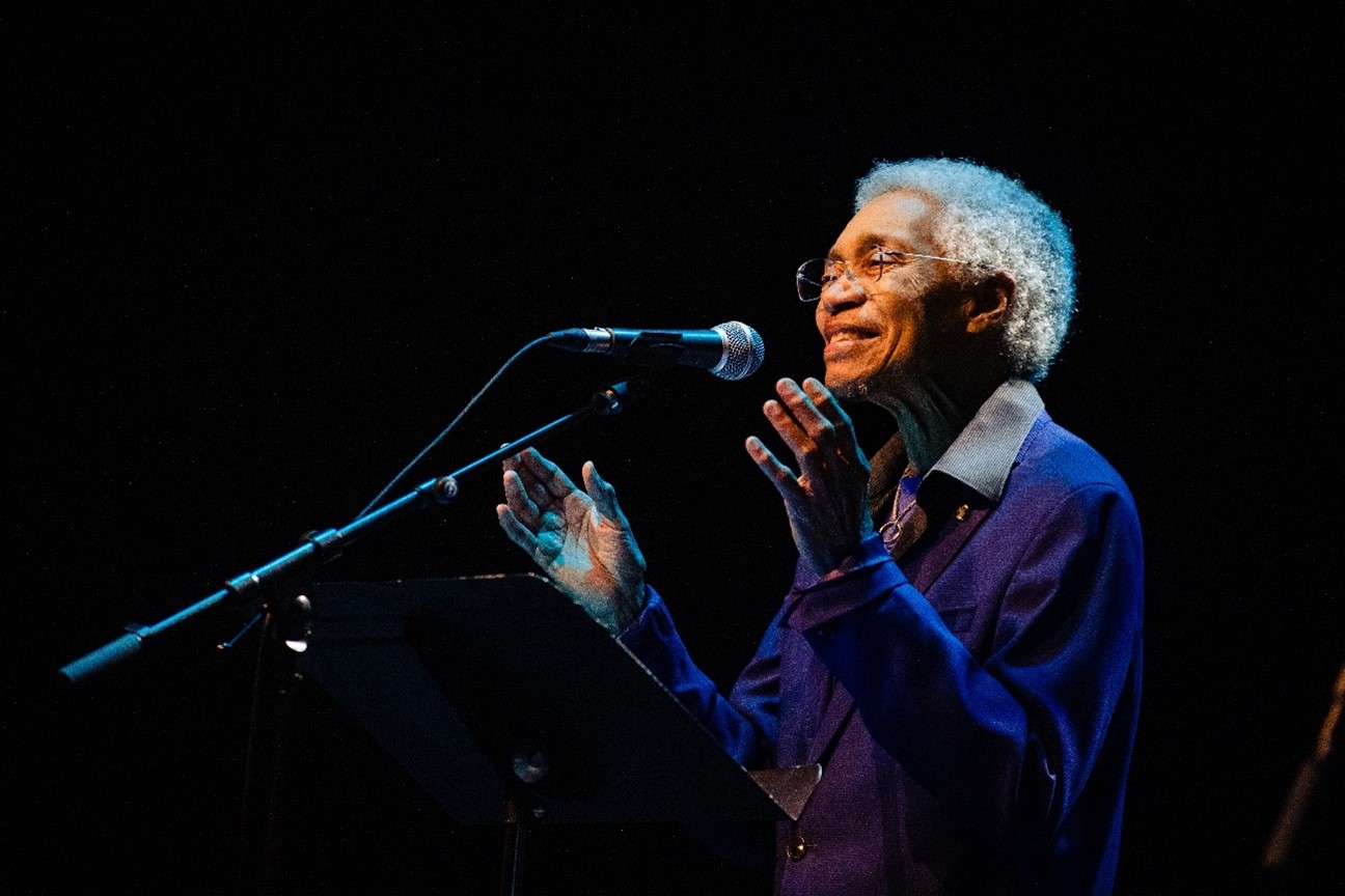 - Beverly Glenn-Copeland ar lwyfan yng Nghanolfan Mileniwm Cymru yn ystod Llais. Llun gan: Jamie Chapman